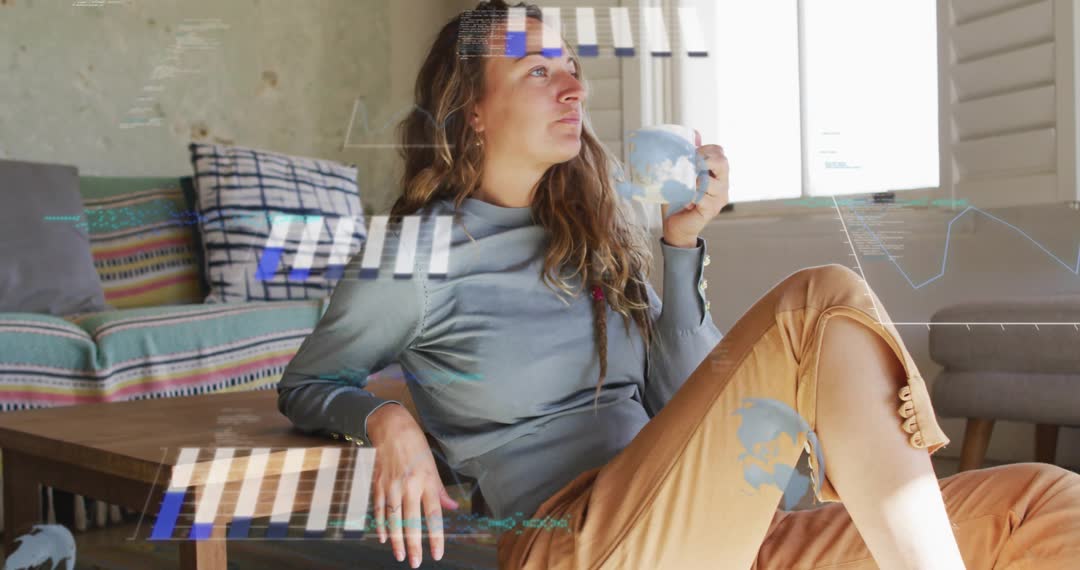 The scene depicts a woman immersed in a modern, digital workspace, sipping coffee during a break or brainstorm. Dashes of animated charts, a globe icon, and graphs suggest data analysis and global business impact themes. Suitable for projects relating to technology in remote work, modern entrepreneurship, insightful data analysis processes, or personalized business strategy. Useful for illustrating the modern intersection of technology and well-being.