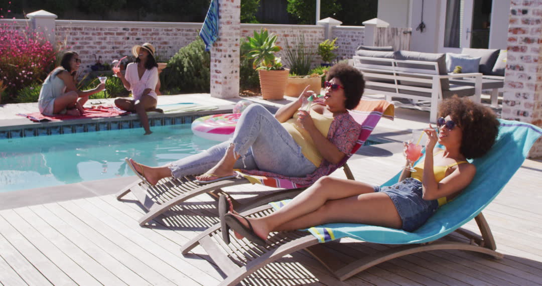 - Relaxed Friends Enjoying Refreshing Drinks by Poolside in Summer Sun