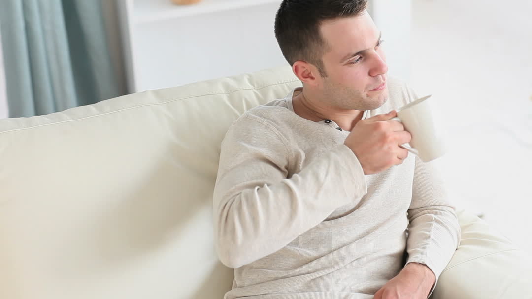 - Relaxed Man Enjoying Coffee at Home in Living Room