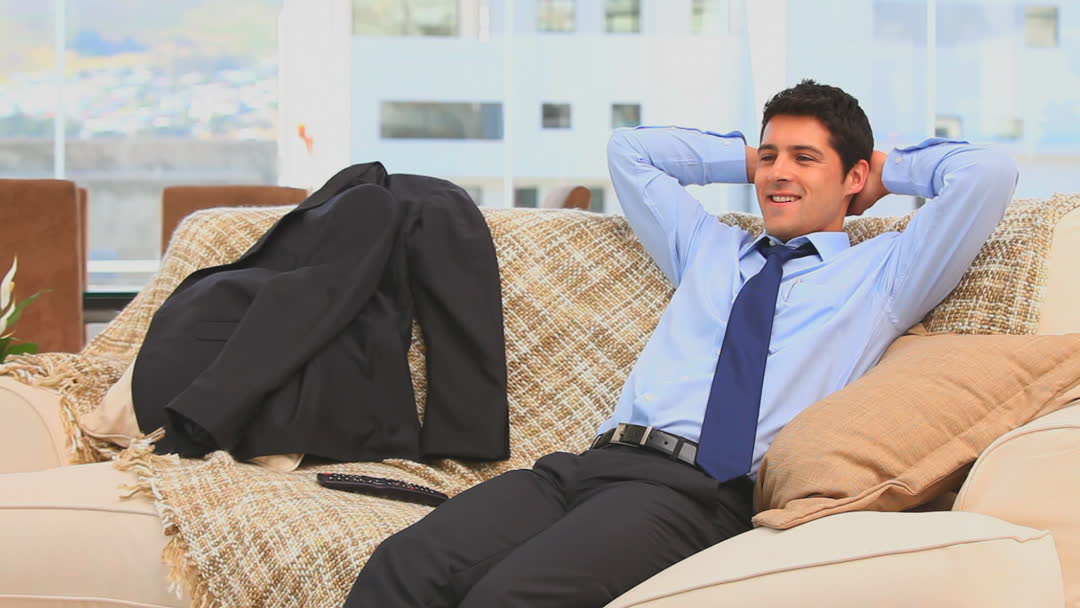 Man in business attire lounging on a soft sofa in bright, comfortable living room, exuding a sense of relaxation and contentment. Useful for portraying work-life balance, restful days, or advertisements for home comforts or relaxation services.