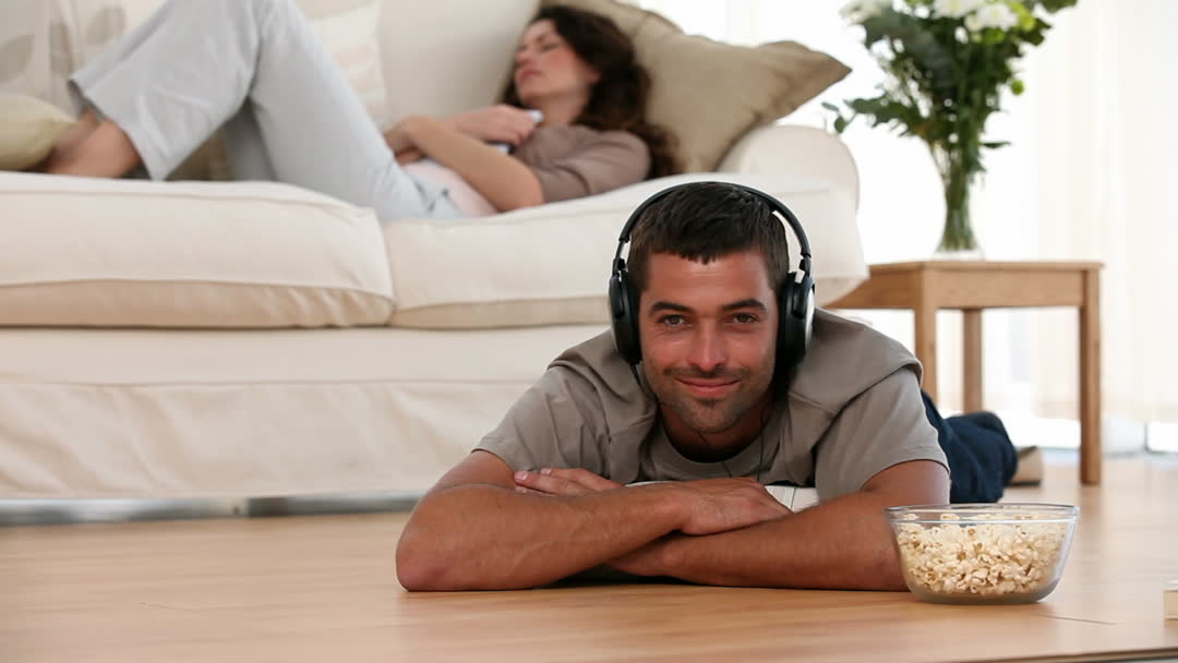 A man lies comfortably on the living room floor, listening to music through headphones next to a bowl of popcorn, while another person is resting on a couch. Ideal for promoting relaxation, home comfort, electronic gadgets, leisure activities, or healthy lifestyle products.