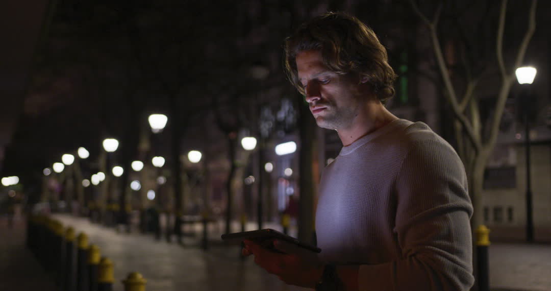 Relaxed Man Exploring Nighttime City Using Tablet Video
