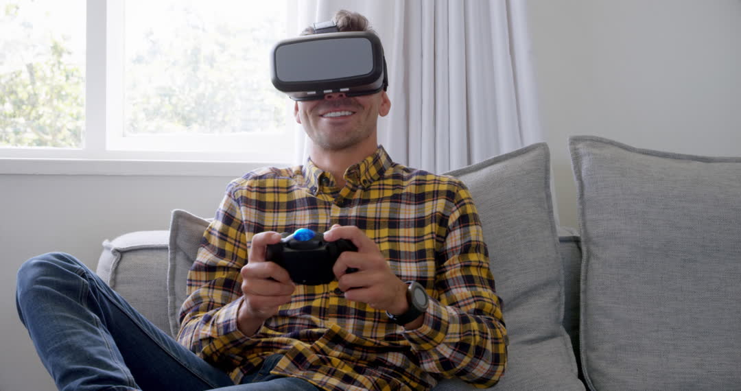 Young man wearing virtual reality headset enjoying an immersive video gaming experience while sitting comfortably on a sofa at home. Ideal for use in articles or promotions related to modern technology, virtual reality advancements, or the appeal of home entertainment systems.