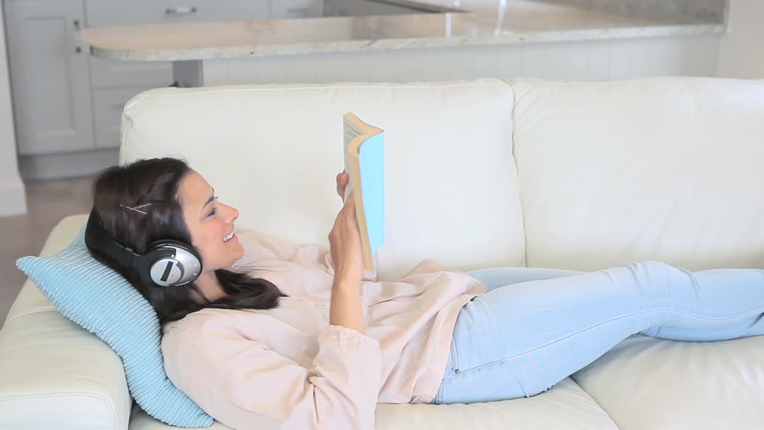 - Relaxed Woman Listening to Music and Reading on Sofa