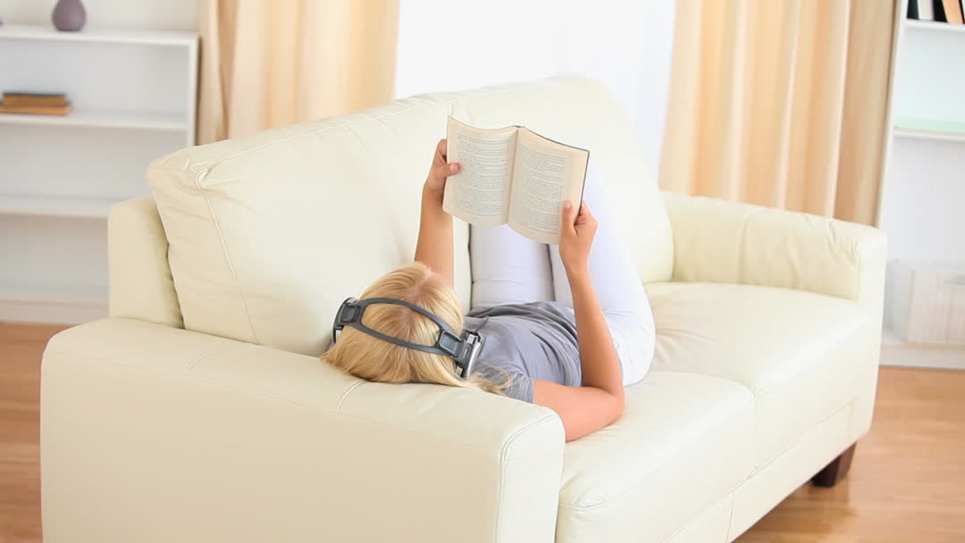 - Relaxed Woman Reading on Sofa with Headphones at Home