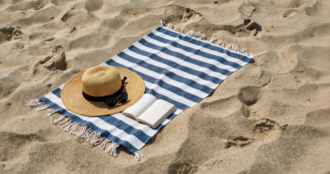 - Relaxing Coastal Beach Scene with Striped Towel and Accessories