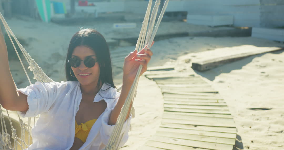 Hispanic woman in a hammock enjoying a sunny day on a beach, capturing the essence of relaxation and vacation. Her shaded sunglasses and beach attire highlight a casual, carefree atmosphere, perfect for summer promotions, travel brochures, and lifestyle blogs. Ideal video for depicting sun-soaked enjoyment in seaside getaways.