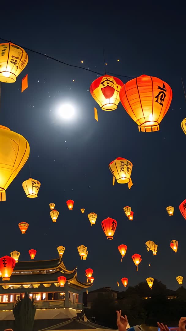 - Releasing lanterns under full moon at temple festival, crowd launching glowing lanterns