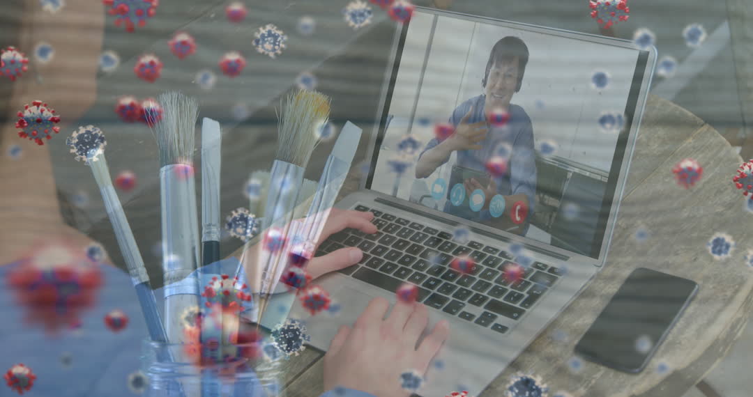 Image illustrates virtual interactions during the COVID-19 pandemic set against digital virus representations. Useful for topics related to remote communication, virtual meetings, pandemic safety measures, and the impact of COVID-19 on work and communication. Highlights importance of maintaining connections through digital means.