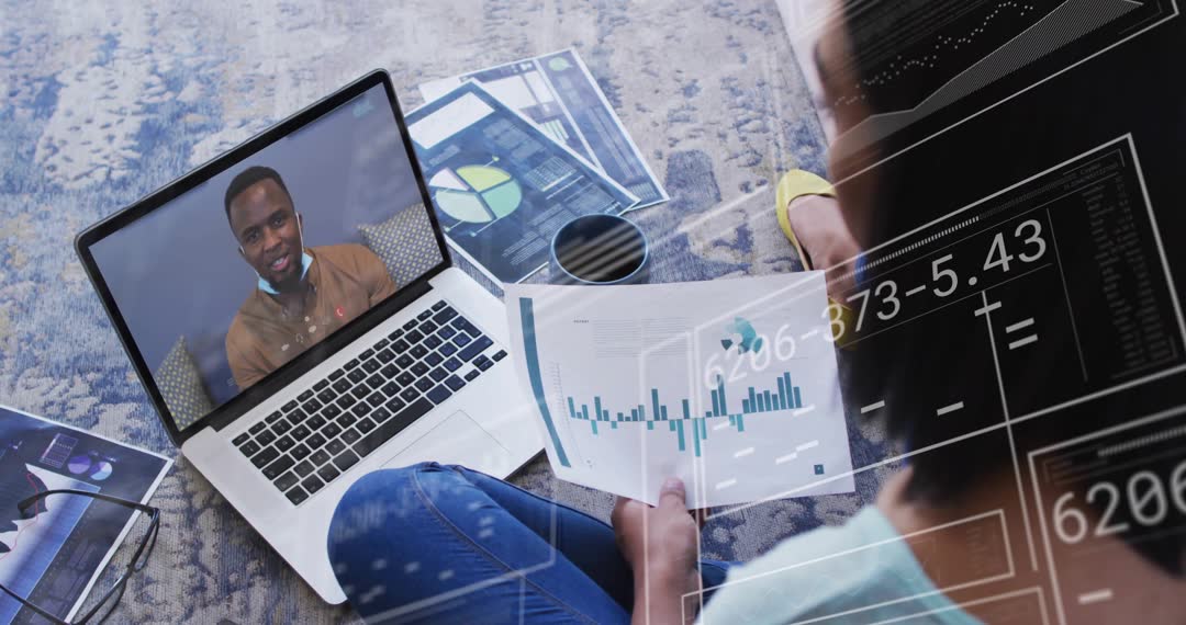 Clip showing woman holding bar chart while participating in remote video call with male presenter visible on laptop and HUD overlays displaying charts, numbers, and analytics. Scene conveying hybrid work, virtual collaboration, and data-driven decision making. Serving corporate training videos, powering webinar intros, enhancing website hero banners for SaaS and fintech, illustrating blog posts about remote work and analytics, supporting presentation backgrounds, and driving social media campaigns. Editing suggestions include adding brand logo, lower-third text, animated HUD elements, subtle color grading to match brand, and cropping for vertical social formats. Composition supporting overlay of headlines or data callouts for marketing, educational, or investor relations content.