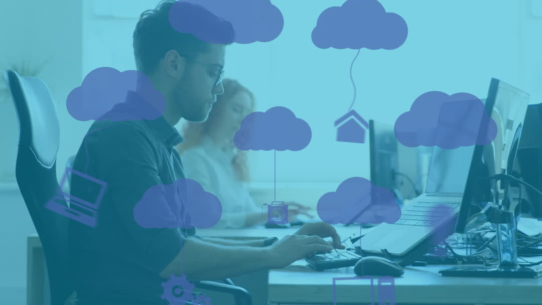 This video illustrates remote work and cloud computing in a contemporary office setting. With transparent cloud and computer icons, it signifies the integration of technology and business activities. Ideal for use in articles or websites about remote work, cloud-based services, modern business practices, or IT infrastructure.