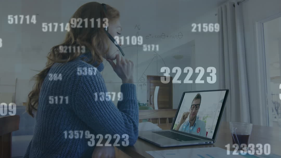 Depicts a business professional in a work-from-home setting engaged in a video call. Overlaid numeric data and charts emphasize modern data analysis and digital communication. Useful for illustrating concepts of remote work trends, online collaboration, and data-driven decision-making especially in business and tech contexts.