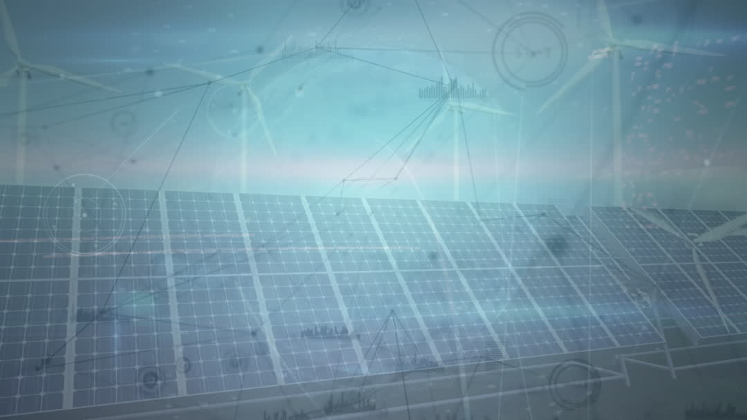 Animation of solar panels and wind turbines with an overlay of data connections suggests advancements in renewable energy technology. Ideal for promoting sustainability, showcasing future energy solutions, or illustrating eco-friendly technology innovations.