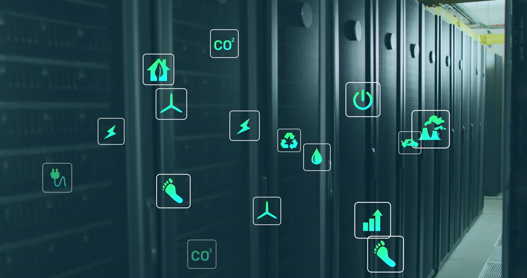 Illustration of various renewable energy icons such as footprints, turbines, and recycling coexisting with data server racks. Represents sustainability and eco-friendly practices in technology environments. Useful for showcasing green technology initiatives in data management and promoting energy-efficient business solutions.