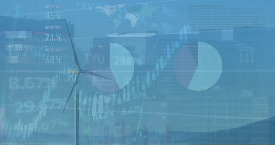 Visual shows a wind turbine overlaid with digital graphs and data, highlighting the intersection of renewable energy and big data analysis. It emphasizes technology’s role in environmental solutions. Suitable for use in discussions on sustainable energy, technological innovation, and economic growth studies.