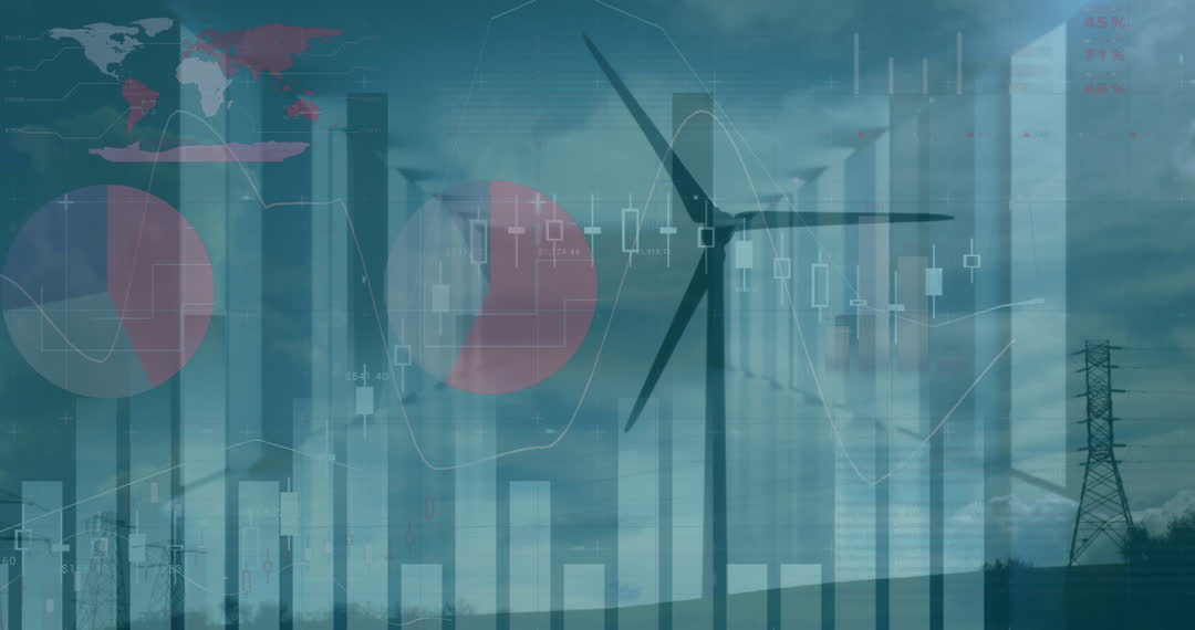 Visual blending of wind turbine with financial charts illustrates renewable energy market trends. Useful for topics in green economy, investment analysis, and sustainable finance initiatives. Insightful as an educational resource on economic impact of energy sectors.