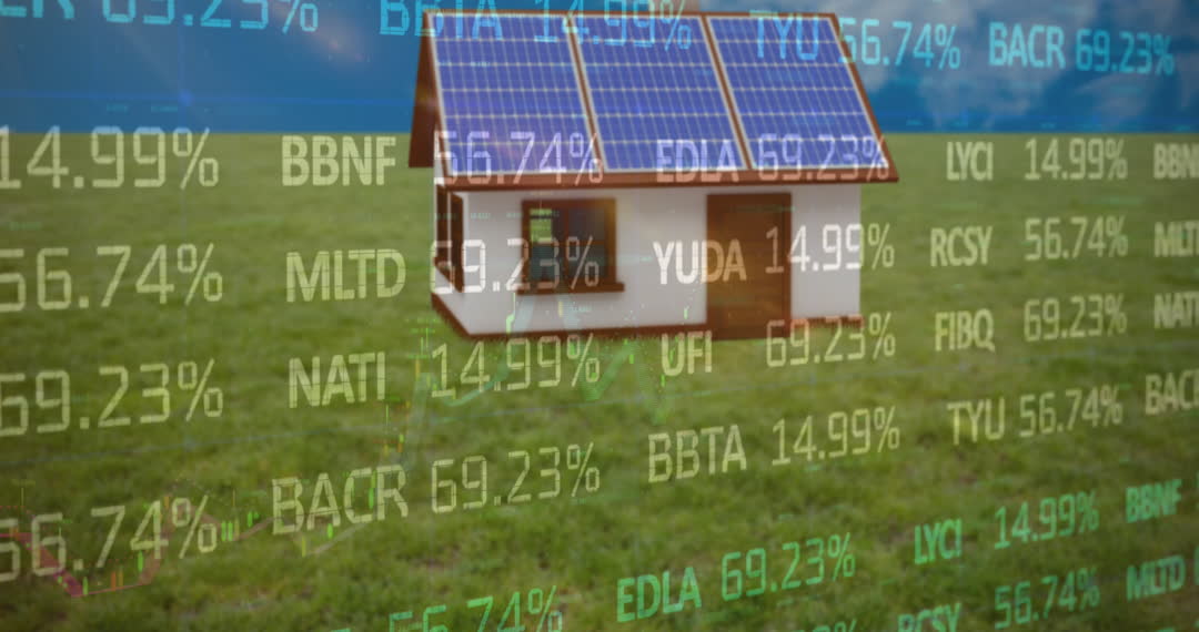 Sustainable house model with solar panels indicating investment opportunities in renewable energy sector, ideal for illustrating eco-friendly financial growth, sustainable investment, and green technology advancements.