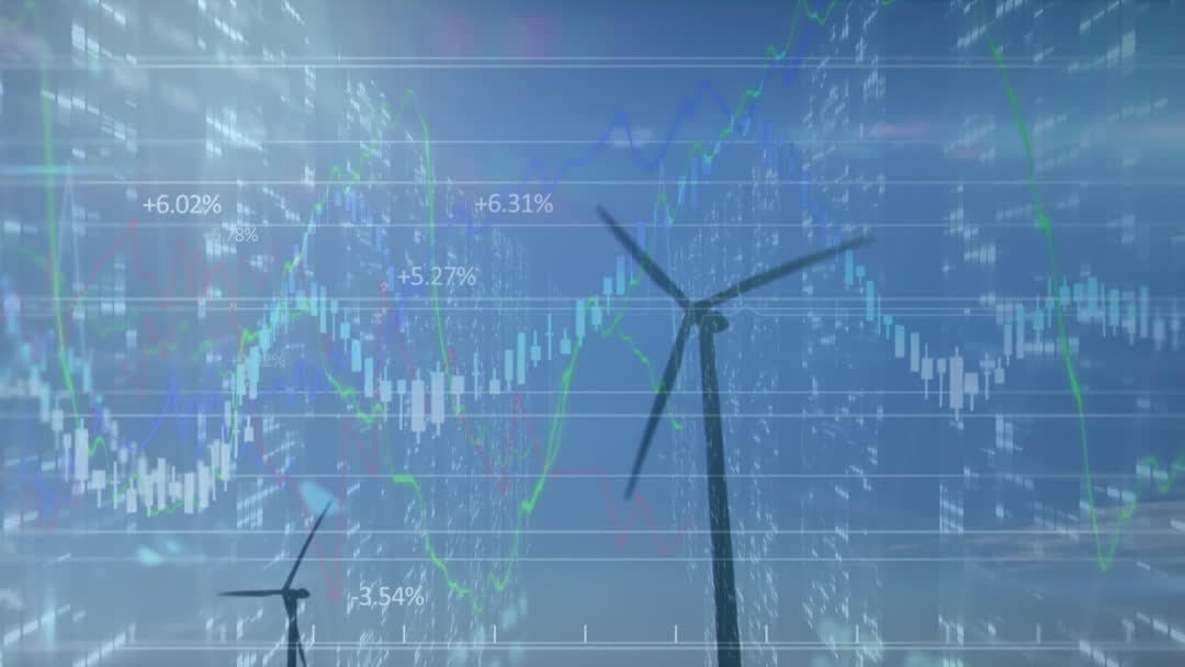 Dynamic visuals depict wind turbines interspersed with animated financial charts and graphs, signifying investment in renewable energy. Suitable for illustrating concepts in sustainable finance, green technology promotion, and digital economy strategies.