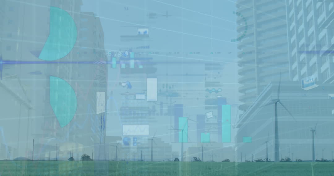 Image merging windmills standing on expansive grassland with animated statistical data overlays set against modern tall buildings. Represents integration of renewable energy technologies with data analytics and business innovation. Useful for illustrating themes related to sustainability, clean energy, and the fusion of nature with high-tech solutions.