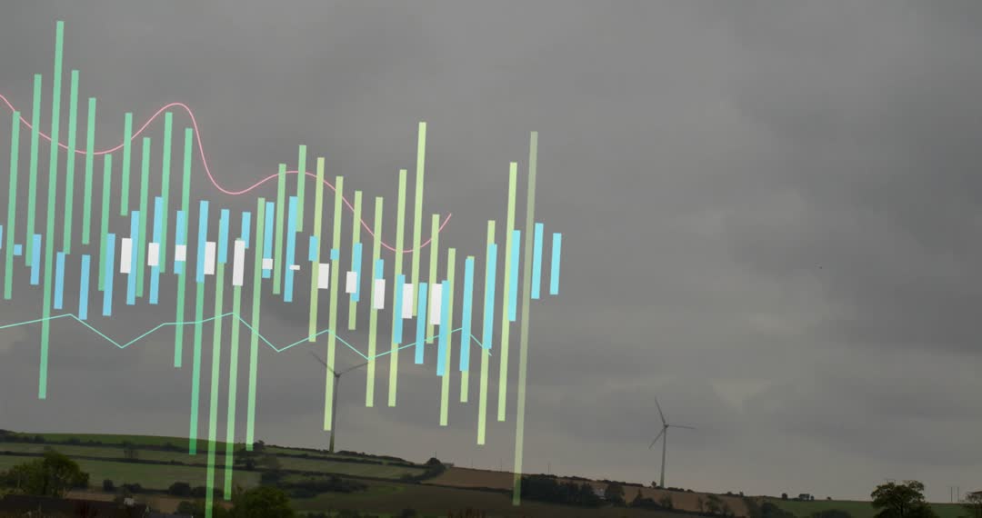Graph animation overlaying landscape with wind turbines captures the blend of technology and renewable energy. Ideal for illustrating concepts of environmental sustainability, renewable energy progress, and green technology advancements. Suitable for use in educational materials, industry presentations, or environmental campaign visuals. Depicts the growing integration of data science in energy management.