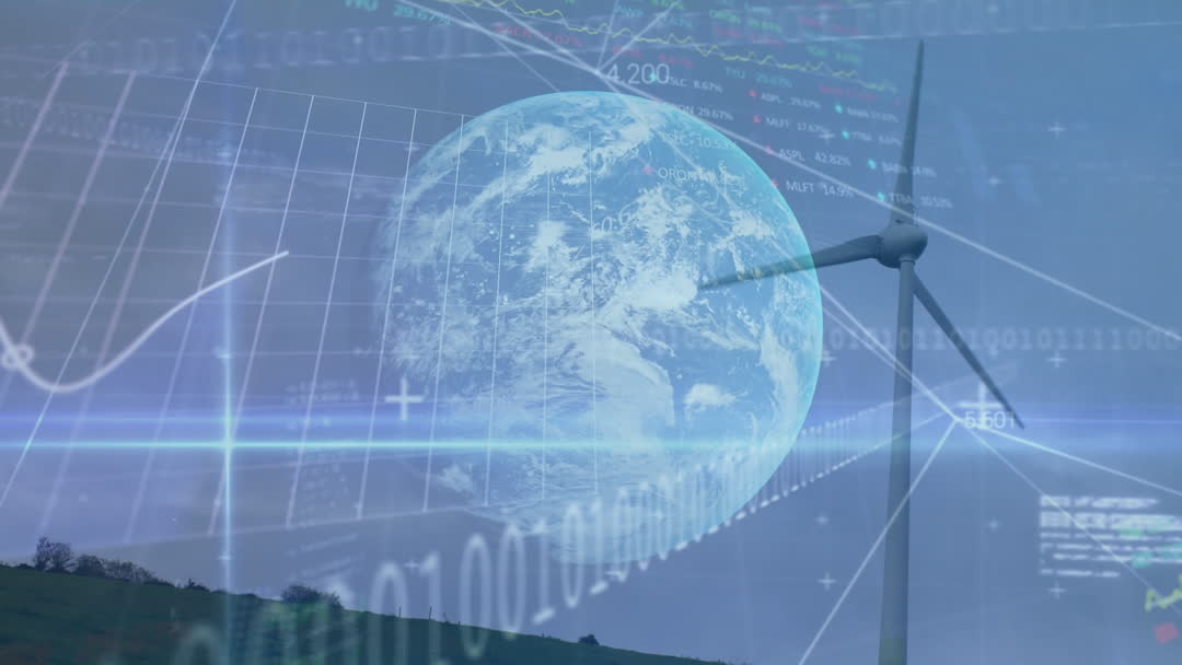 This visually unique video blends the themes of renewable energy and global finance, with a wind turbine and the earth contrasted with digital financial overlays. It can be used for themes around environmental sustainability, global economic initiatives, and technology solutions in addressing climate change challenges.