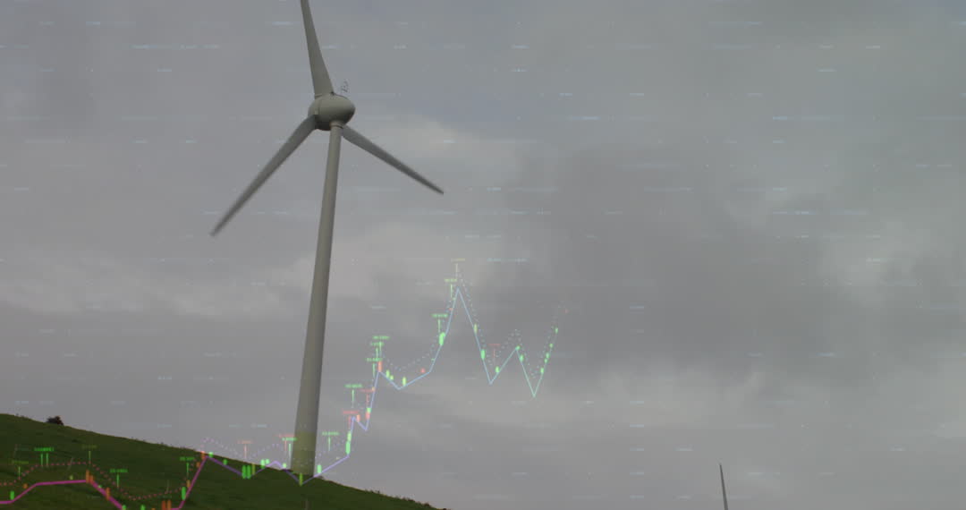 Visual showing a wind turbine against cloudy sky with financial data overlay, suggesting integration of technology with renewable energy. Ideal for concepts related to sustainable energy, green investment, and smart technology in alternative power systems.
