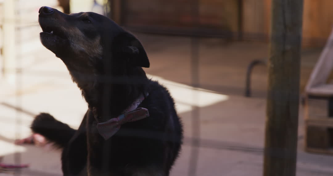 This scene captures a rescued black dog barking with excitement while its tail wags energetically inside a dog pound. The warm daylight highlights the animal’s eagerness and vitality. This visual is ideal for content related to animal rescue stories, shelter adoption campaigns, or materials promoting pet safety and welfare. It could also be used in articles discussing the importance of adopting pets and supporting local shelters.