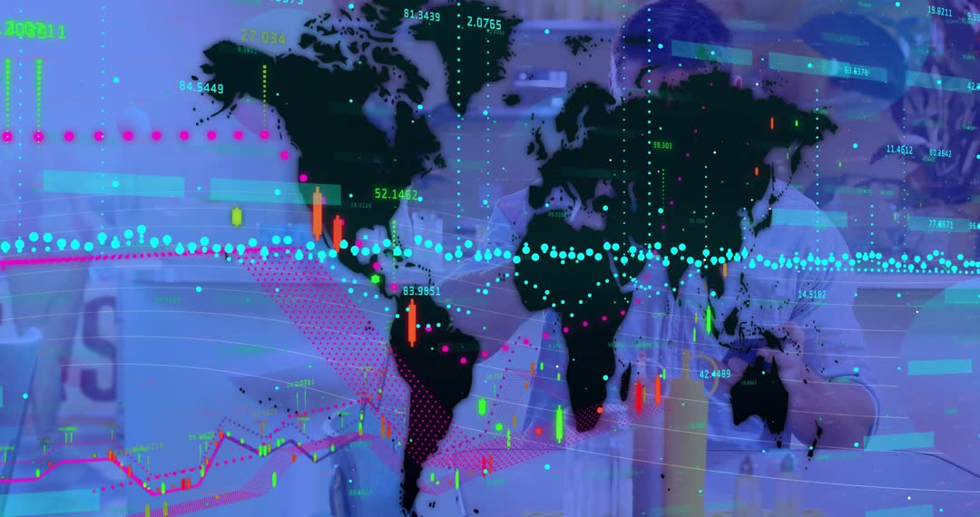 Visual depicting researchers analyzing complex global financial data with dynamic visual elements such as world map overlays, neon dots, and candlestick charts. This video is ideal for illustrating articles or presentations on finance technology, market trends, investment strategies, and innovative financial analytics. Suitable for use in financial news, fintech blogs, or educational content related to economics and data science.