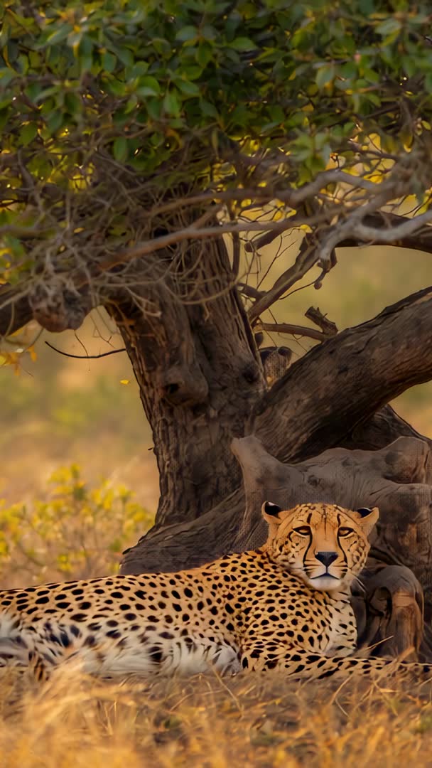 - Resting cheetah raising head under gnarled tree in golden savannah vertical video