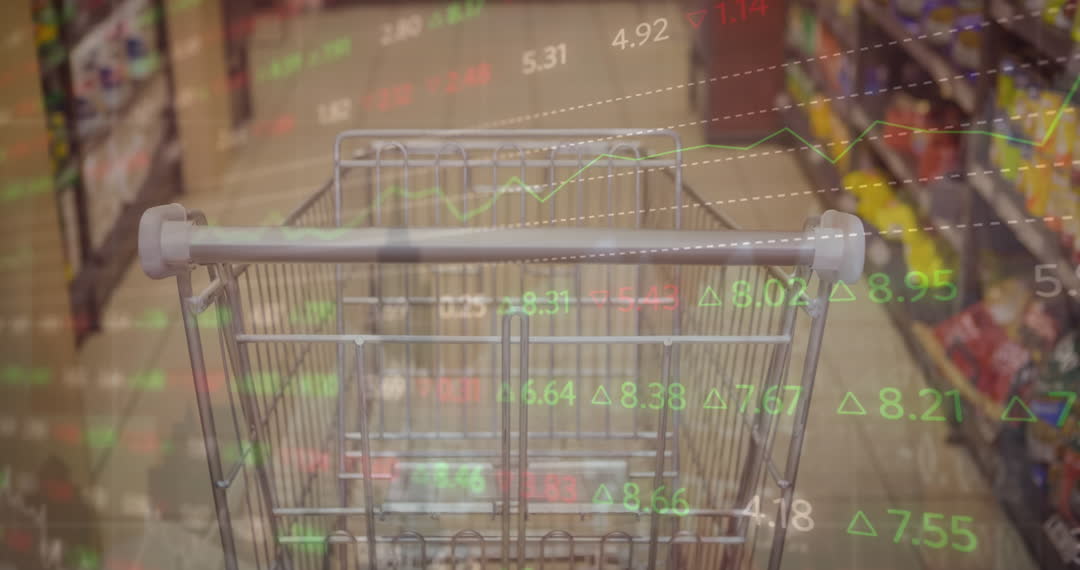 Overlaying financial data graphics on a shopping cart represents the integration of economics with consumer behavior, showcasing visualization for global economic studies and market researchers. This can be used in presentations or articles discussing retail industry trends, finance reporting, e-commerce impacts, and market analysis projects.