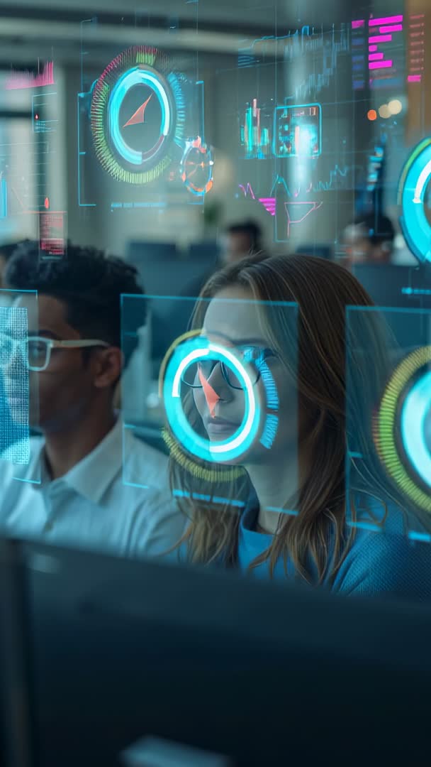 AI Generated Video. Vertical video showing reticle forming and locking onto woman wearing glasses and blue top while holographic HUD overlaying workstation. Scene featuring team members collaborating, data visualizations animating, and UX elements floating in foreground. Footage conveying focus, user interaction, surveillance, and advanced analytics workflow. Suitable for technology product promos, AR and VR demo reels, corporate innovation videos, cybersecurity and UX training, and educational content about human-machine interaction. Use as background clip for websites, presentations, and social media vertical ads, or as hero visual for app demos and investor pitches. Color palette featuring cool blues and neon accents, allowing easy color grading and text overlay space on top and bottom.