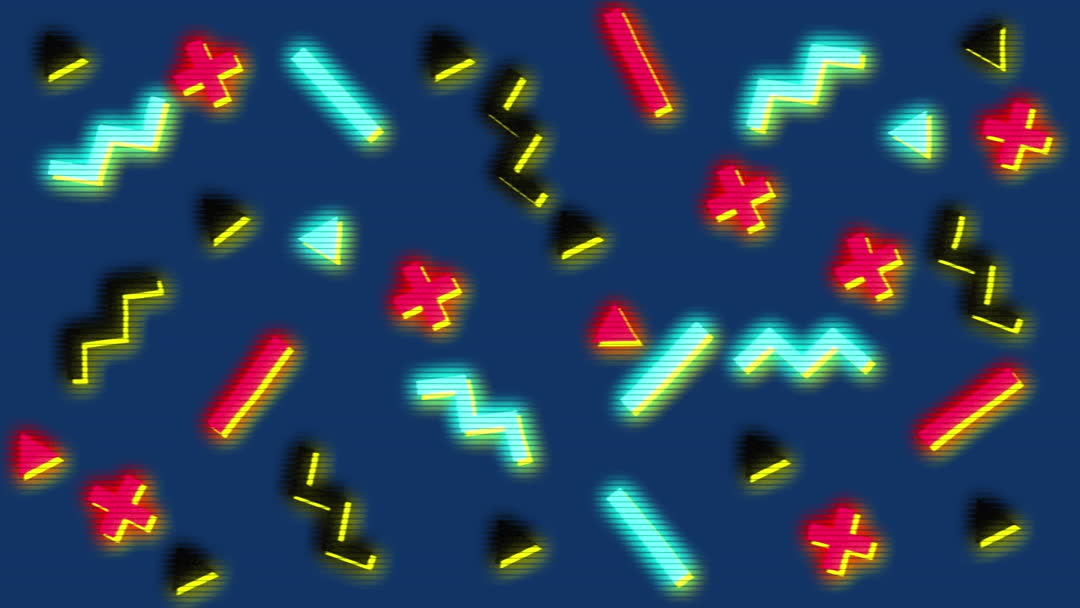 This lively design features bright geometric shapes moving against a vivid blue backdrop, giving it a retro digital art appearance. Ideal for social media graphics engaging viewers with vibrant and playful design elements. It can effectively capture attention as a background in digital marketing or educational materials focused on creativity and modern aesthetics.