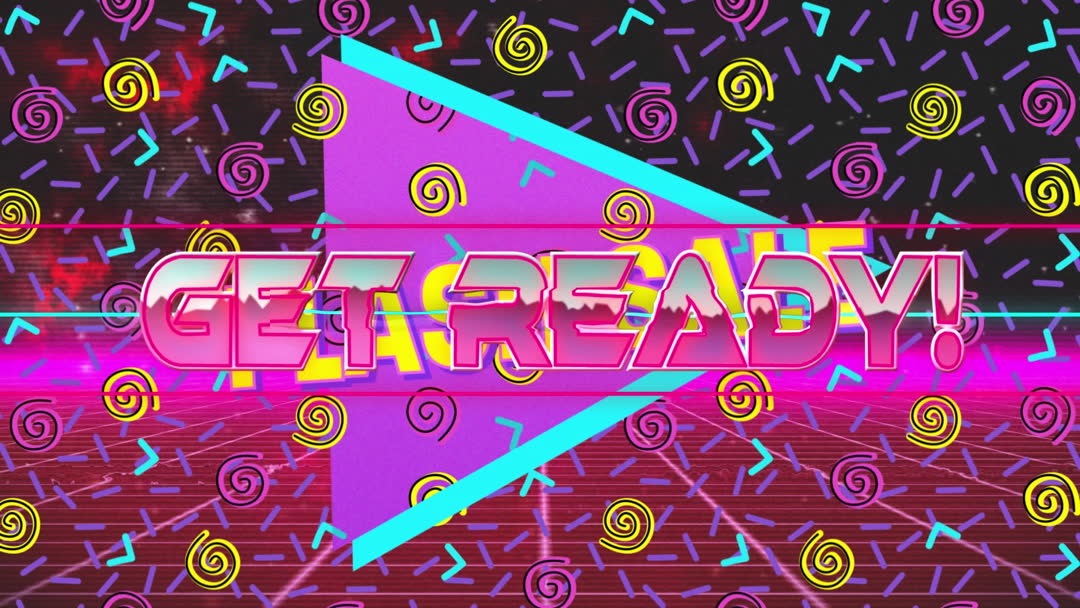 Vibrant, geometry-inspired background with bold 'Get Ready!' text originating from classic arcade themes. Exploration of nostalgia in digital design, suitable for event promotions, gaming content creation, video intros, social media campaigns targeting retro aesthetics as well as modern tech-oriented audiences.