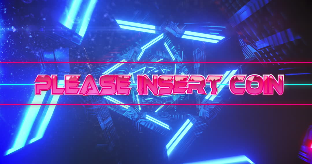 A vibrant digital animation showcasing a 'Game Over' and 'Please Insert Coin' prompt framed by neon blue light trails reminiscent of 80s retro arcade games. The glowing and dynamic aesthetic captures the essence of vintage gaming. This visual is ideal for nostalgic gaming projects, enhancing retro-themed events, or as a backdrop in video productions related to gaming history or neon synthwave art.