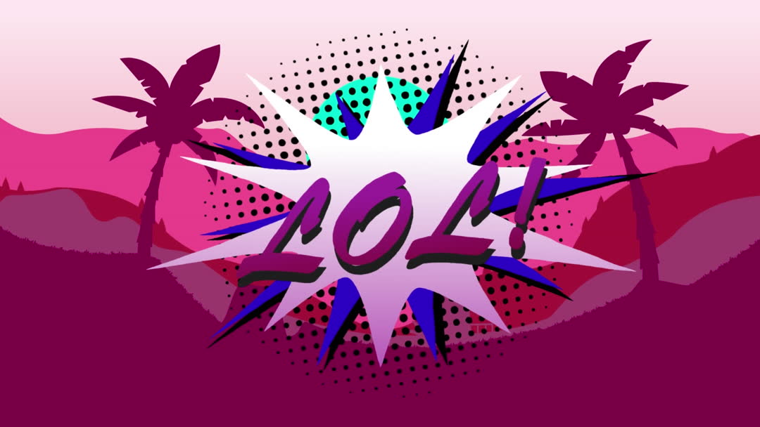 - Retro Comic LOL Explosion with Palm Trees and Sunset