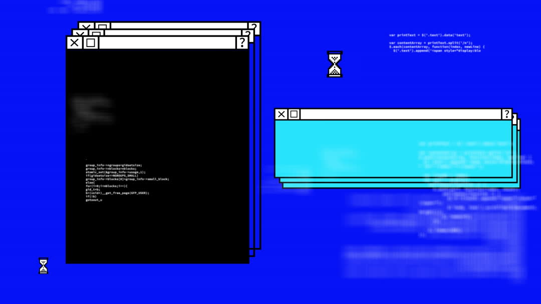 This visual features retro-style computer file windows alongside a classic egg timer loading icon set against a bold blue background, symbolizing data processing and communication. It could be used to represent themes of technology, digital communication, and network interfaces in presentations, marketing materials, or educational content about the evolution of computer interfaces.
