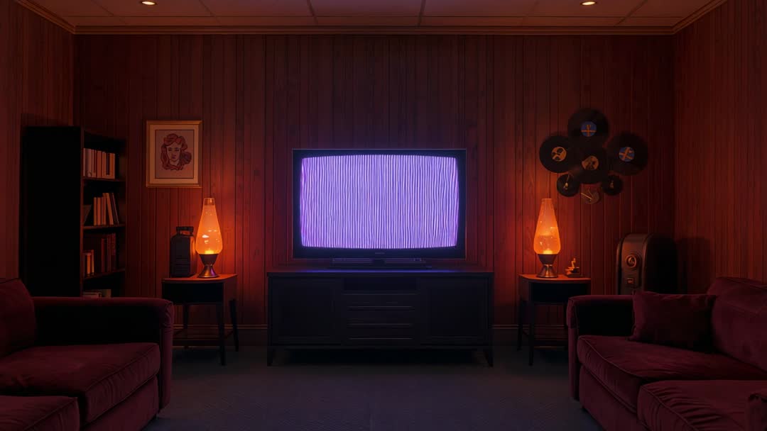 - Retro Den with Static TV and Warm Ambiance Lighting