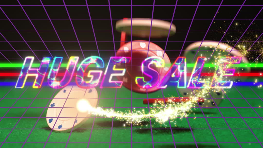 This vibrant graphic merges a retro eighties design with a dynamic casino theme. Poker chips fall in slow motion, attracting attention to the 'Huge Sale' message with a shimmering light effect. Ideal for promotional banners, online advertisements, or event flyers aimed at capturing the vintage nostalgia. Perfect for businesses looking to appeal to customers with a love for classic aesthetics and casino thrills.