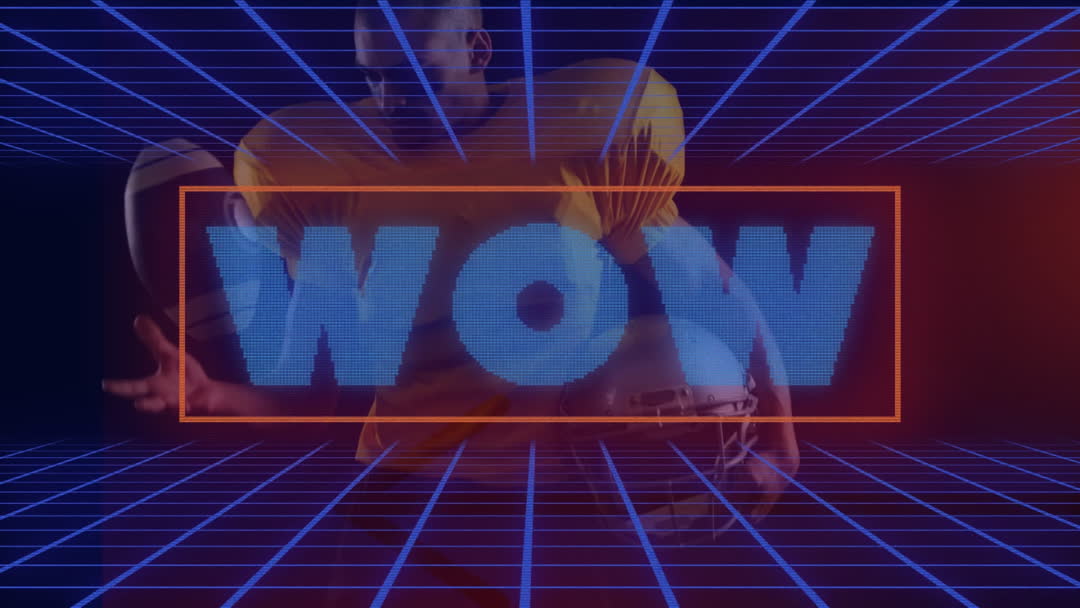 Mixing retro aesthetics with sports videory, this visualization features a dynamic WOW text overlay against an American football player, set within a neon grid pattern. Perfect for sports communities, vintage or gaming promotions, and media projects highlighting athletic excitement.