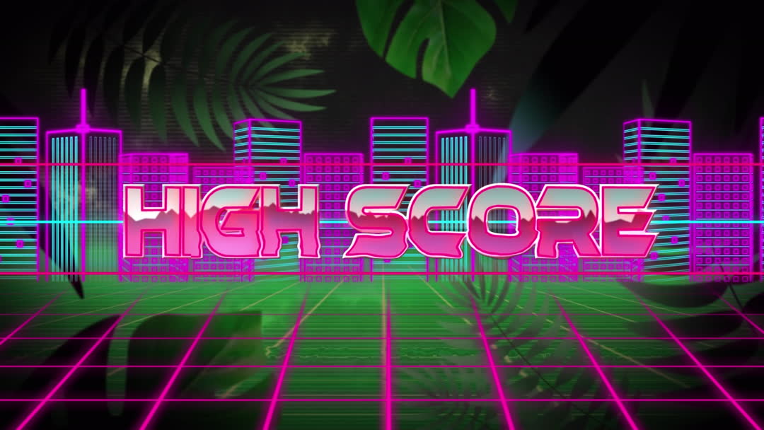 Vintage 1980s theme showcased by a high score title in bold neon colors set against a virtual cityscape. Neon digital artistry reflecting retro gaming concepts and synthwave aesthetics can be used for gaming projects, retro-themed digital art collections, or website designs emphasizing technology and nostalgia.