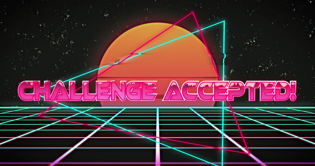 Retro digital artwork featuring bold text 'Challenge Accepted' against a grid and neon elements. Neon colored geometric shapes frames contain vibrant videory with an 80s and vaporwave aesthetic. Perfect for use in gaming, motivational content, technology presentations, social media visuals, or video projects conveying a sense of readiness and energetic style.