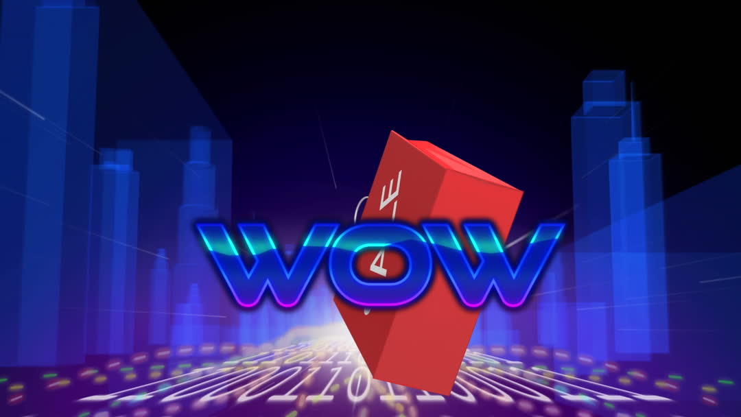3D rendering depicts a futuristic city skyline under a dark blue backdrop with digital motion lines. A vibrant "WOW" graphic adds a retro video game element. Suitable for creative projects, tech presentations, digital art backgrounds, and retro-themed video content.