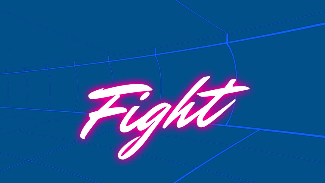 Stylized retro animation depicting the word 'Fight' in blue grid space, ideal for use in gaming, digital entertainment, communication concepts, or as a background for promotional materials.
