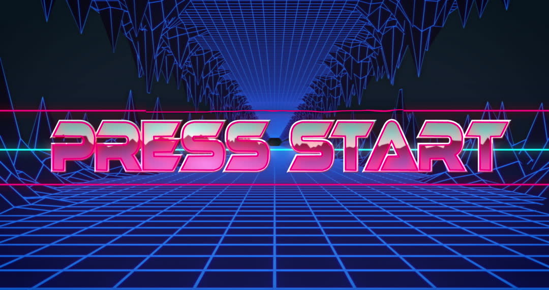 Bright neon text invites user to start game, set in digital, grid-patterned tunnel reminiscent of 1980s arcade games. Perfect for video game promos, tech-themed presentations, or as a backgrounds for new digital projects rooted in nostalgic 80s themes.