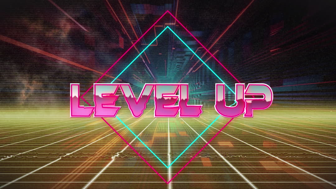 - Retro Futuristic Level Up Neon Sign Over Digital Grid