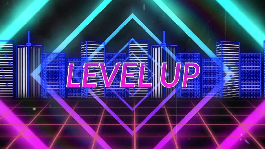 Retro Futuristic Neon Level Up Graphic with 3D Cityscape Video