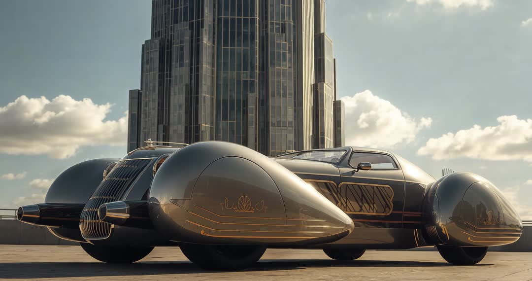 AI Generated Image. This scene showcases an intricately designed retro-futuristic roadster parked near the imposing Art Deco skyscraper. The vehicle's unique style and streamlined design highlight an elegant combination of past and future automotive innovation. This video can be used in discussions related to luxury cars, architectural aesthetics, vintage and futuristic design themes, or conceptual automotive advancements.