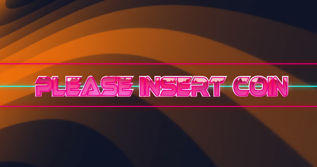 Retro 'Please Insert Coin' text appears with vibrant neons against dark abstract shapes. Perfect for digital design projects, social media content, and marketing materials featuring a nostalgic 80s or arcade theme. Can enhance thematic events or presentations with a tech-savvy vibe.