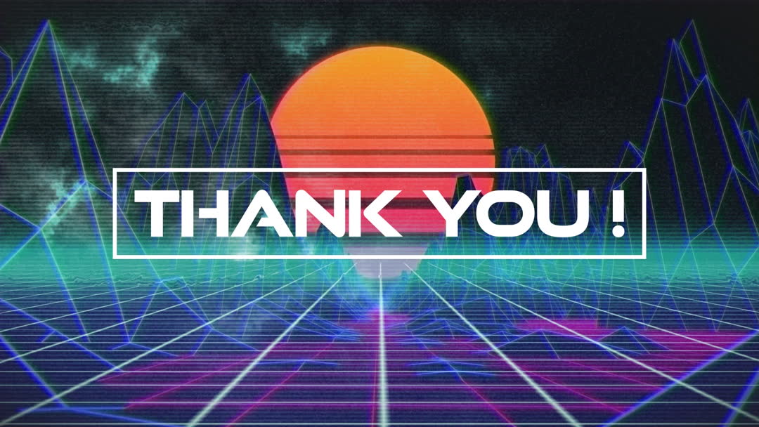 Animation showing a thank you message with a distinctive retro 80s style, featuring glitch effects and vibrant neon colors. Overlaid on a digitally rendered landscape reminiscent of classic video game interfaces, this design invokes a sense of nostalgia with futurism. Ideal for use in digital campaigns, video game credits, technology-related presentations, and websites seeking a vintage tech ambience.