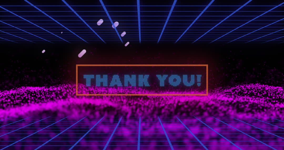 Retro style with neon lighting creates sci-fi ambiance ideal for events, presentations, digital media. Use as thank you card or send prompt from a virtual conference. Also fits in video intro/outro clips.
